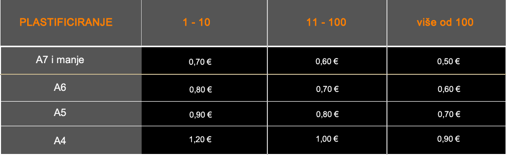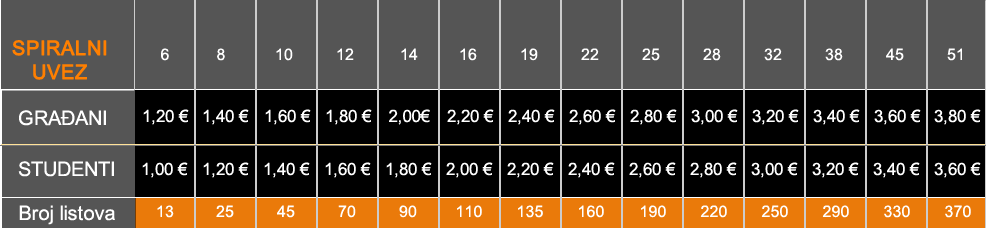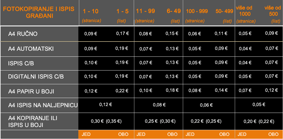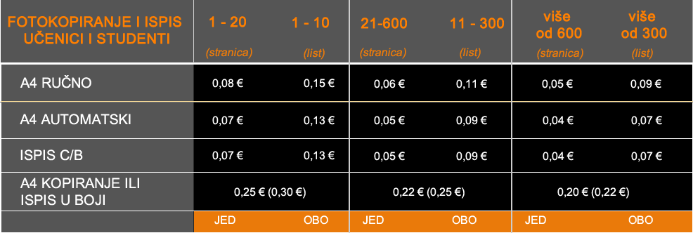 prvu stranicu (uračunato pohranjivanje podataka), a za ostale prema cijeniku fotokopiranja